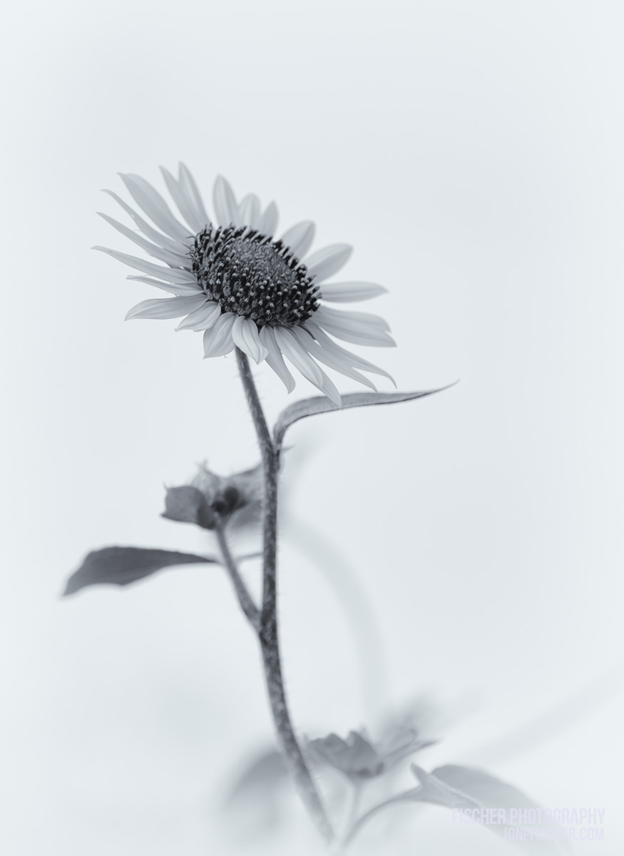 Honestly, I don’t recall what this photo looked like before I processed it in this high-key monochrome look. Maybe I’ll look in my Lightroom catalog when I get home and update the post with a before & after image to show the difference if I remember to. I do remember deciding, after processing several photos in color, that this one might look good as a monochrome, to help bring out the subtle details in the pedals and center of the flower. Bright yellow does not show theses details very well, unlike the soft blue and gray hues after the conversion. Processing was done in Nik Color Efex Pro 2, starting with one of the high-key presets and adjusted and fine tuned. The subtle blue hue is actually rather difficult to pick up on unless the photo is set against a pure white background, and looks near white when printed and set in a simple black frame as I have done at home (11×14 print for sale with or without frame).